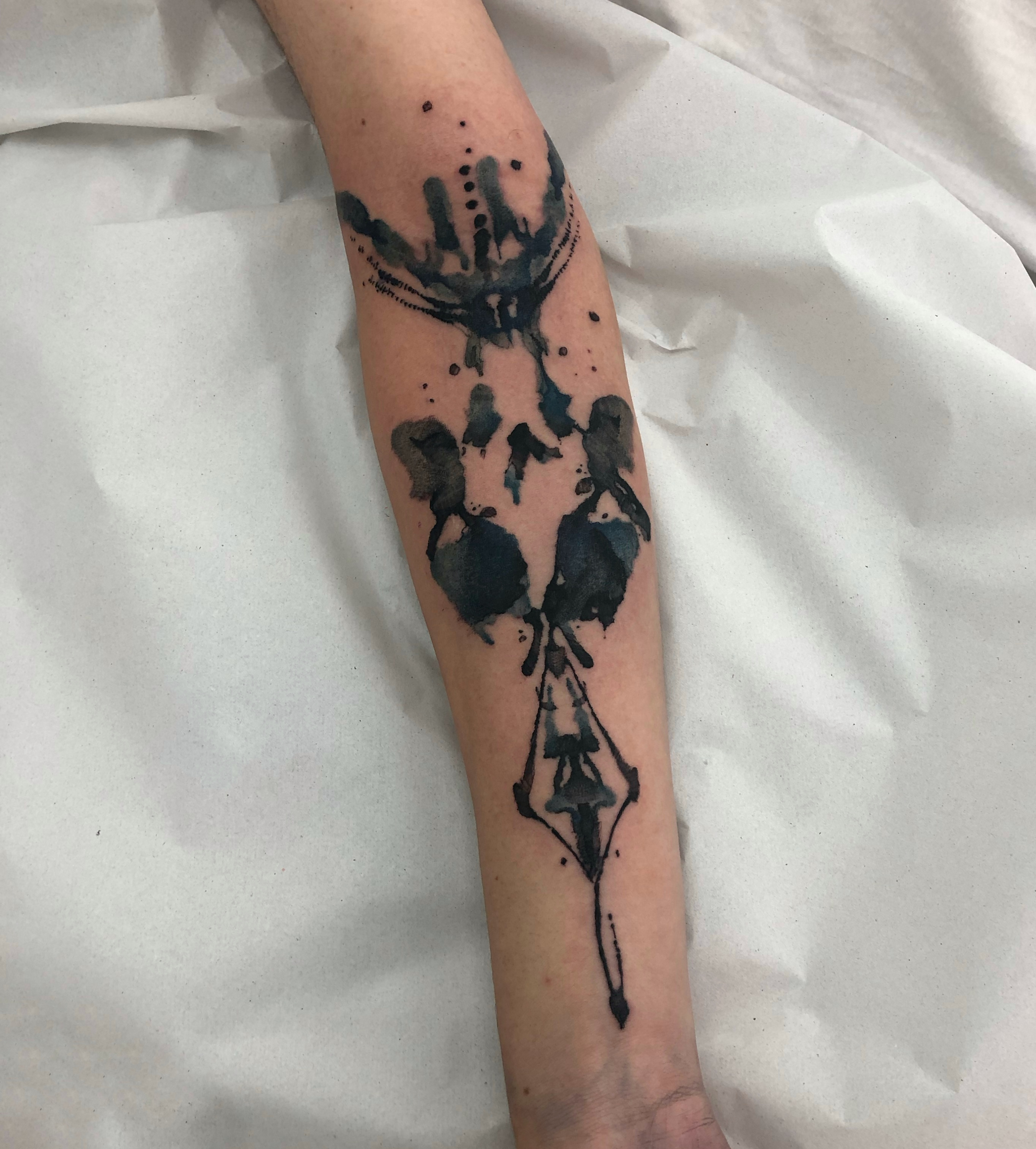 - Abstract blackwork tattoo on forearm with vertical gesture composition, ink splashes and linear structure