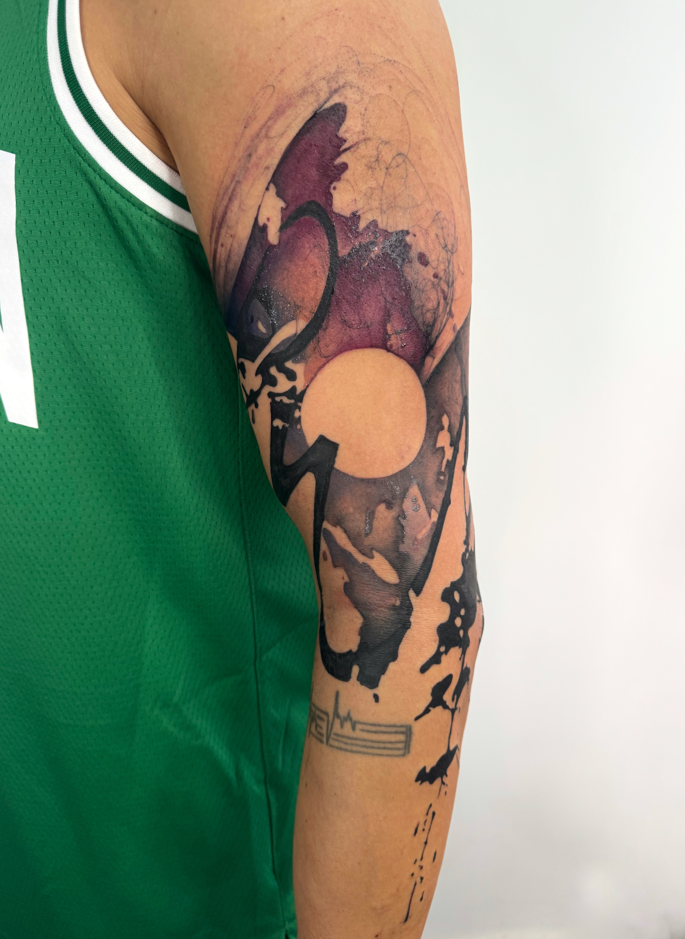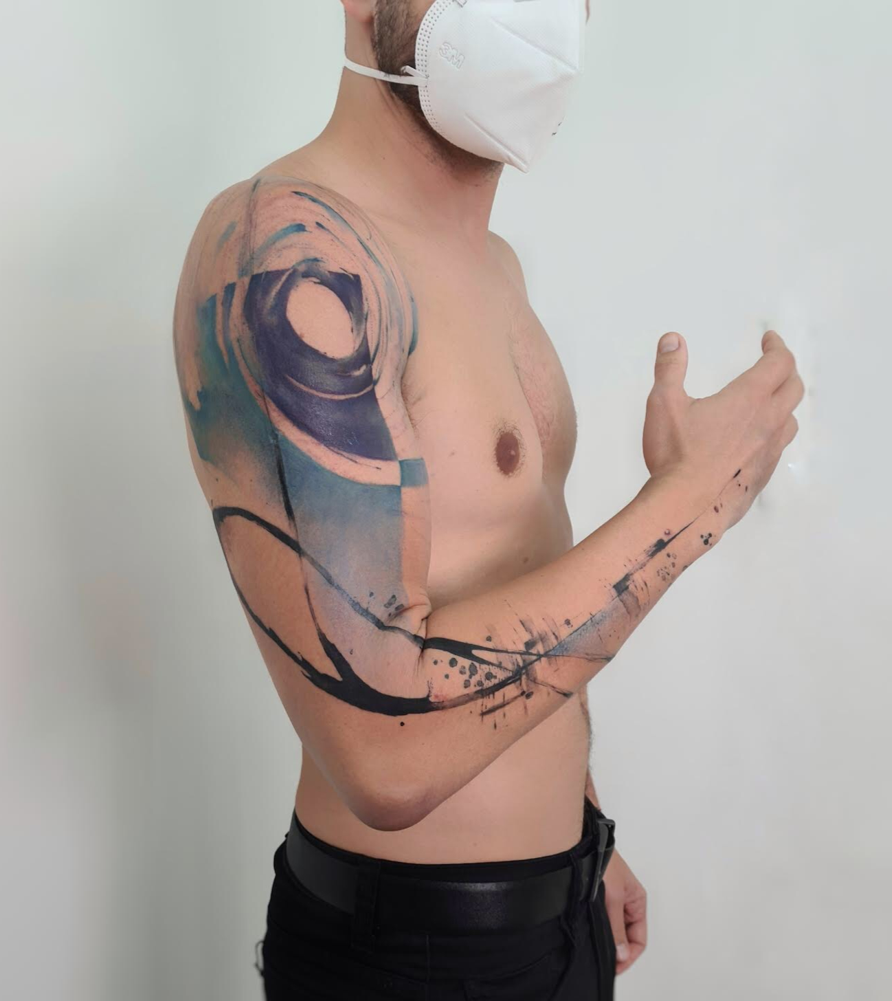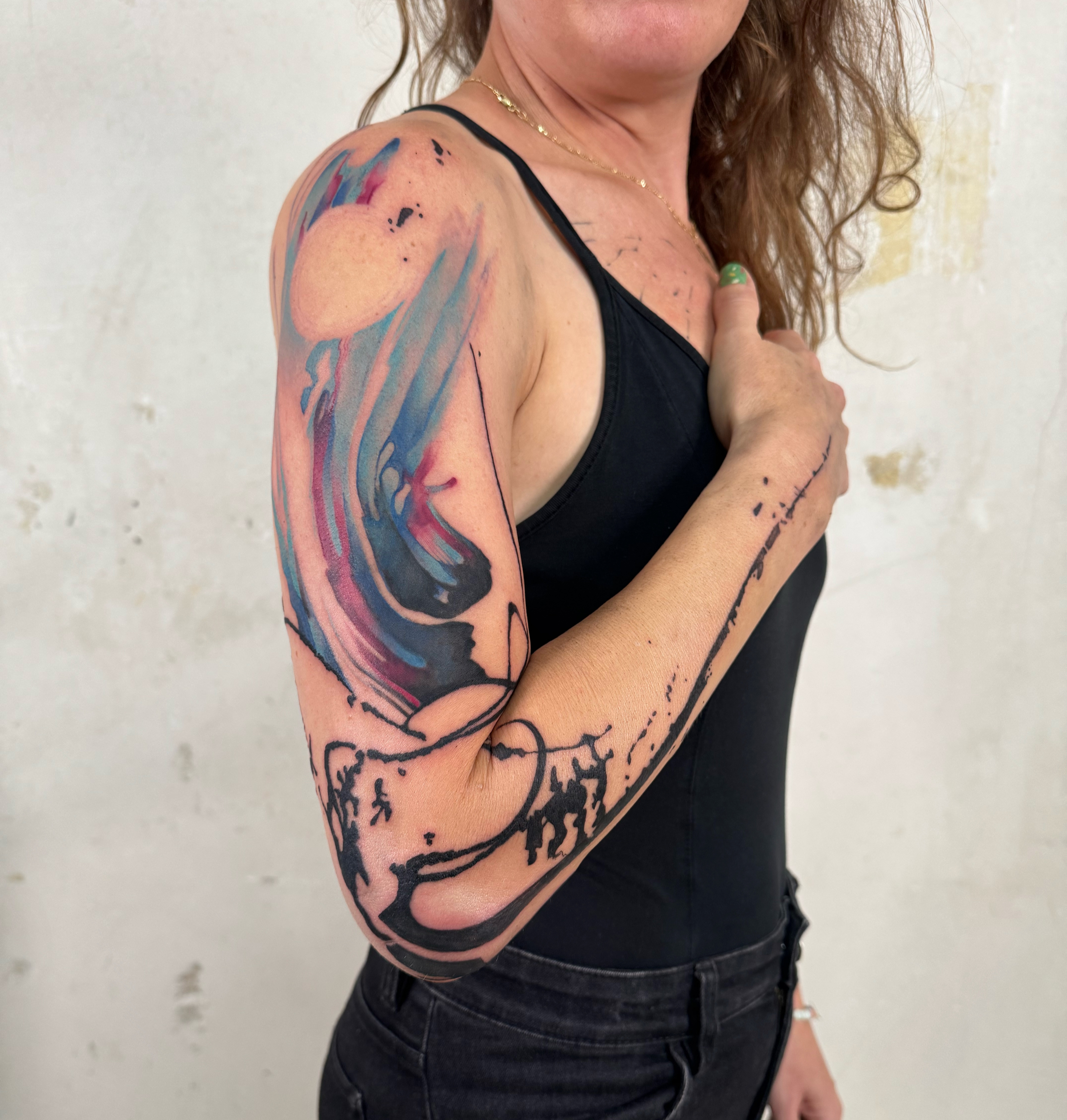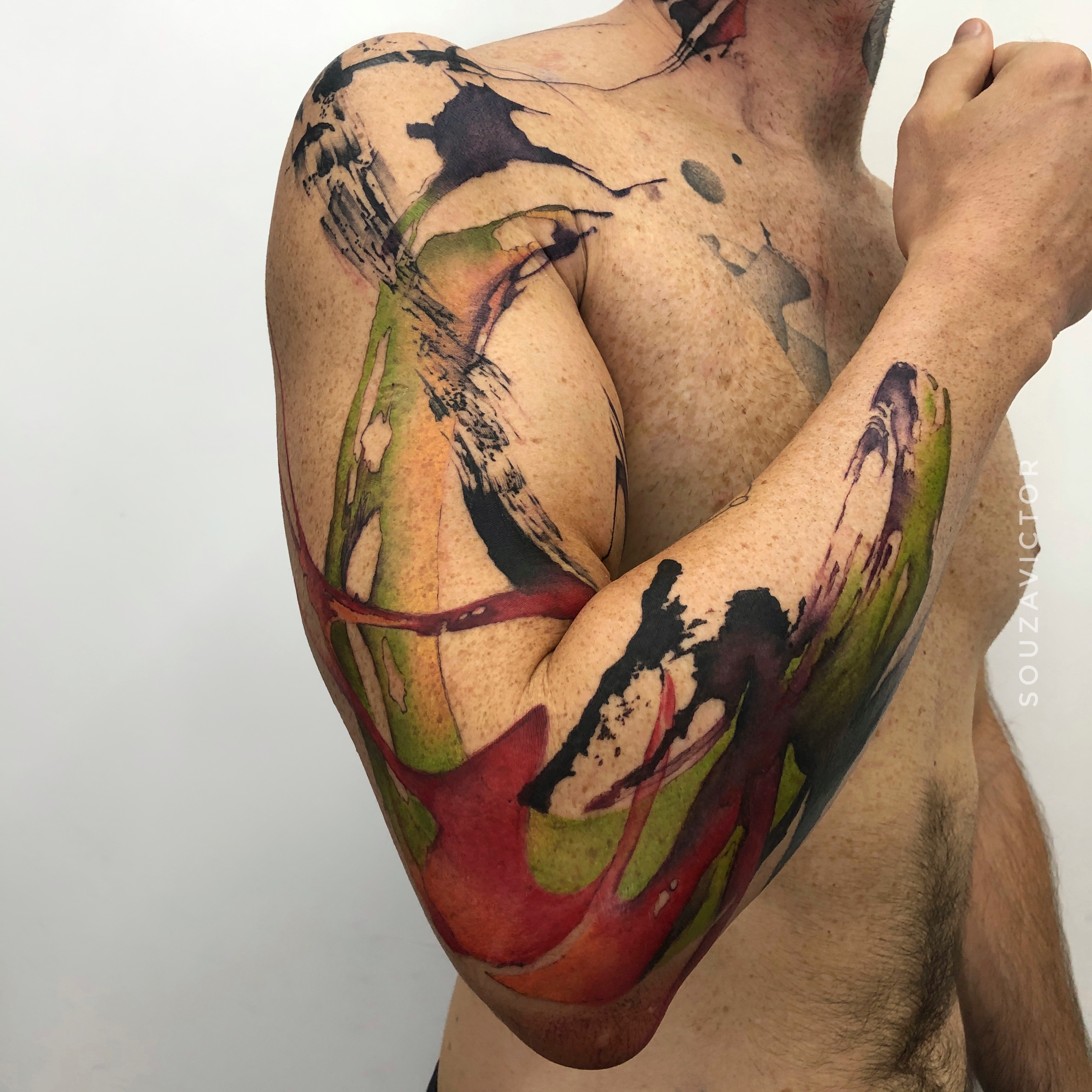 - Abstract colorful tattoo on arm with organic shapes, fluid gradients and expressive composition