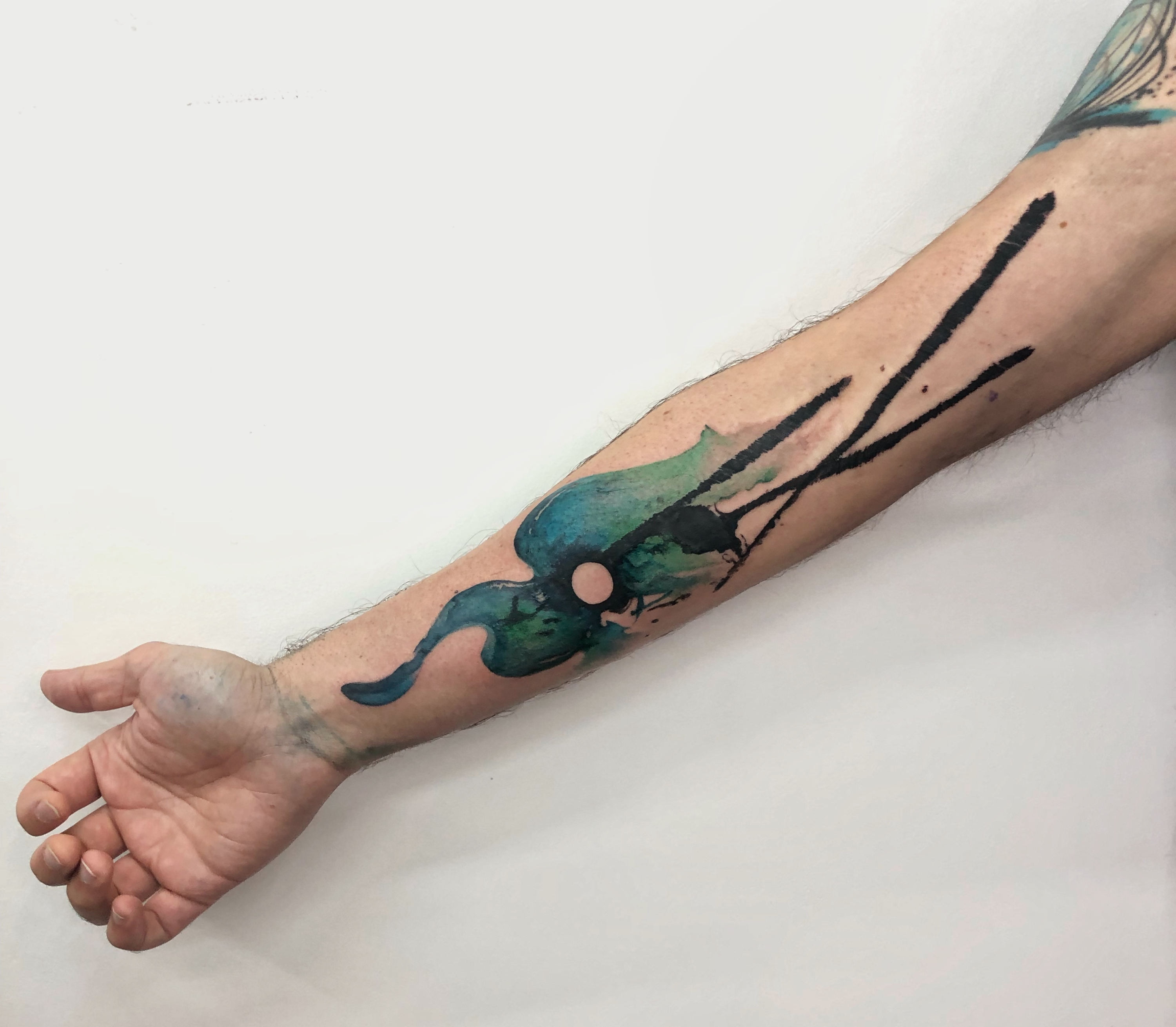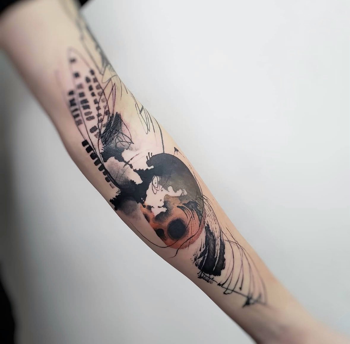 - Abstract forearm tattoo with circular structure, black ink texture and expressive gesture lines