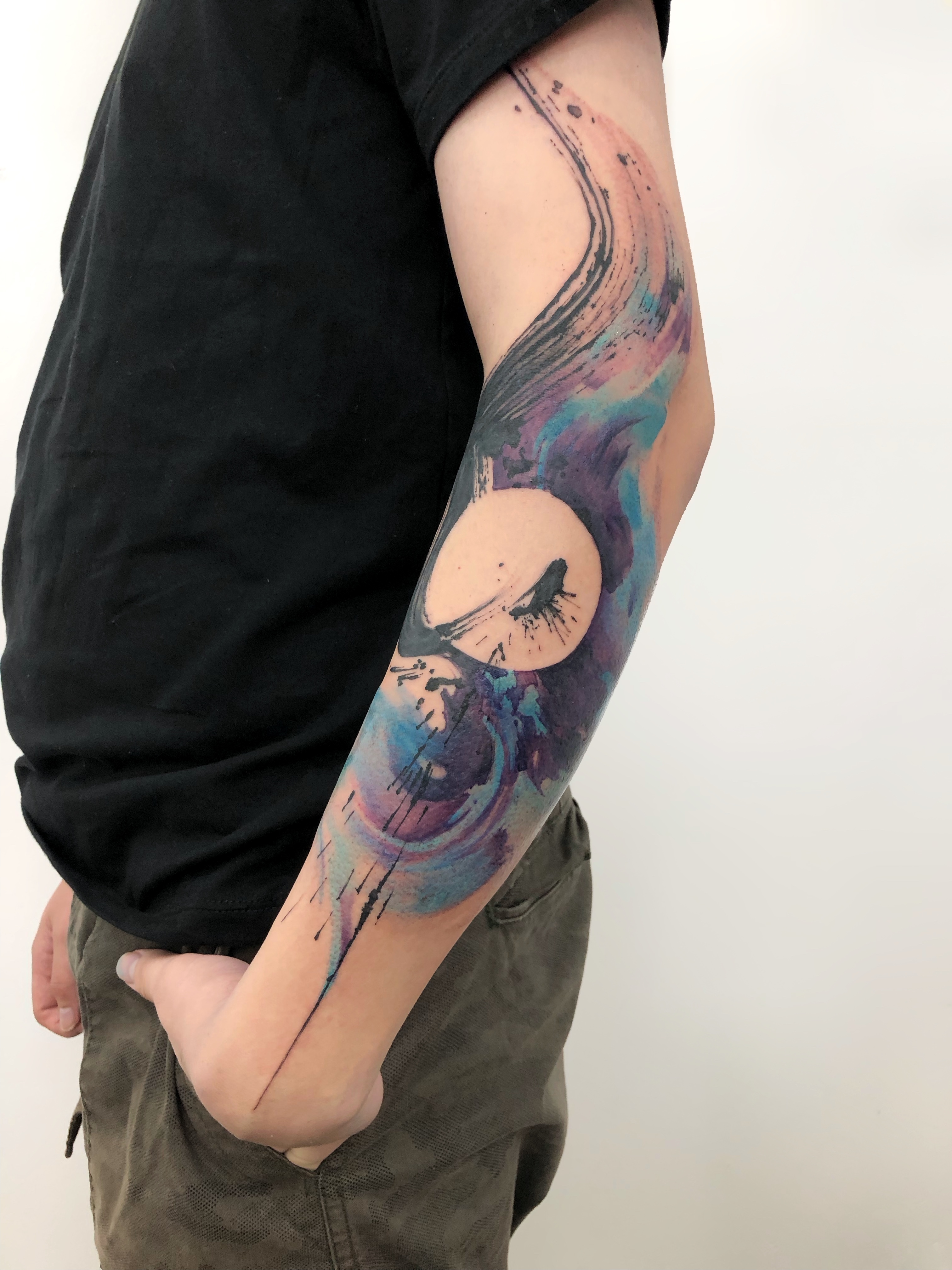 - Abstract color field tattoo with circular form and gradient tones on arm, organic flow and soft transitions