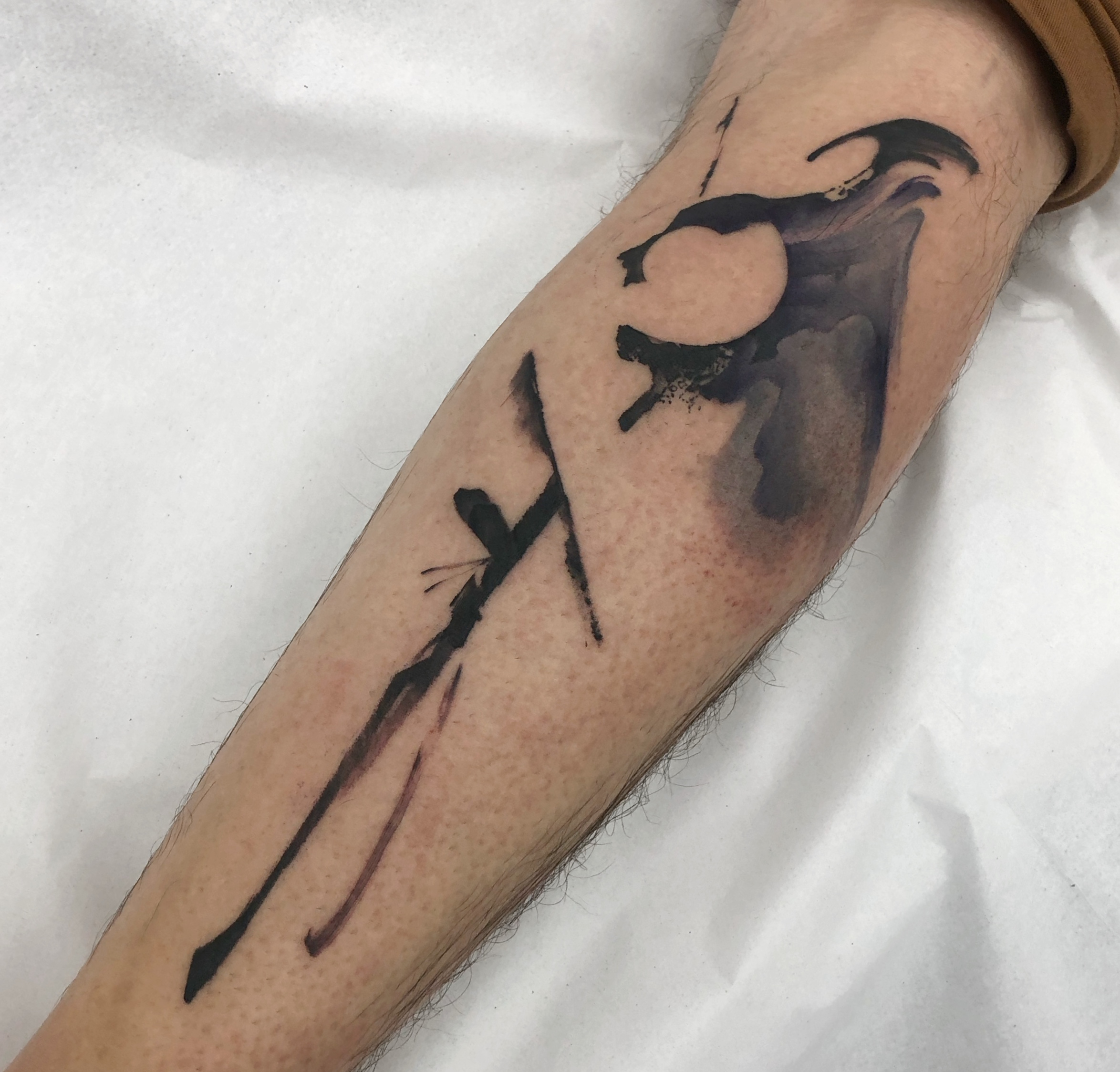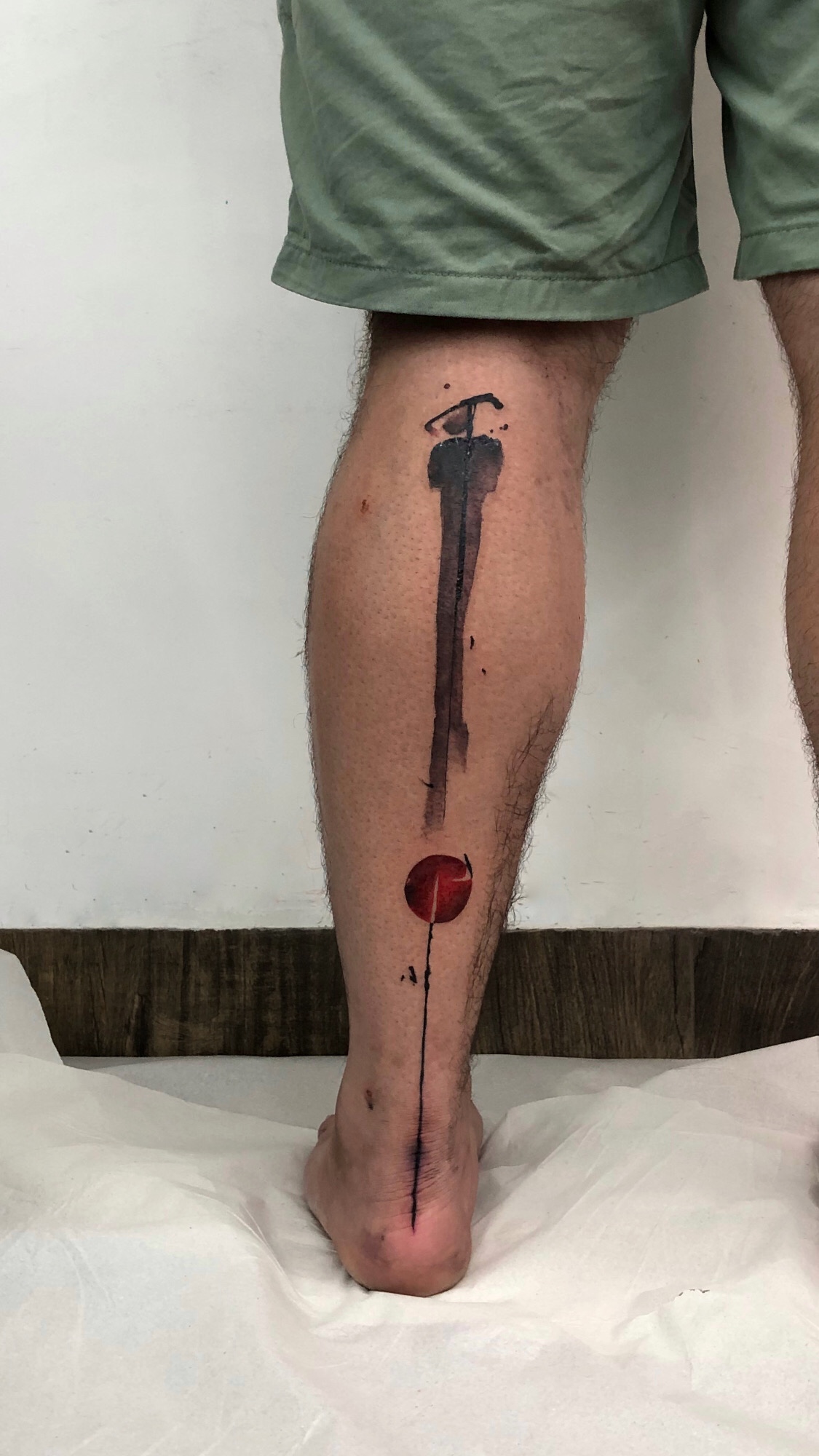 - Minimal black abstract tattoo on leg with vertical line and subtle gesture, clean and reduced composition
