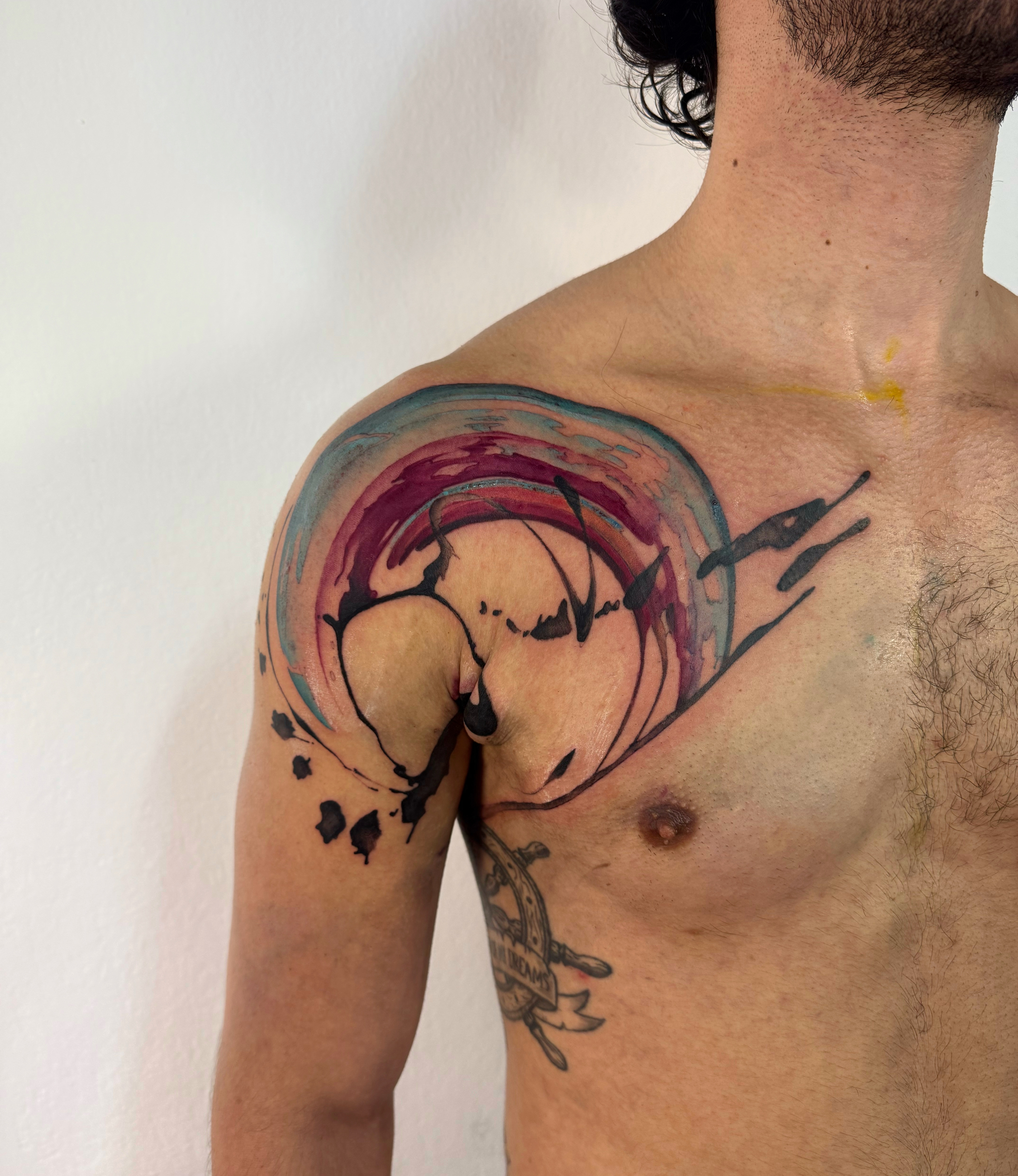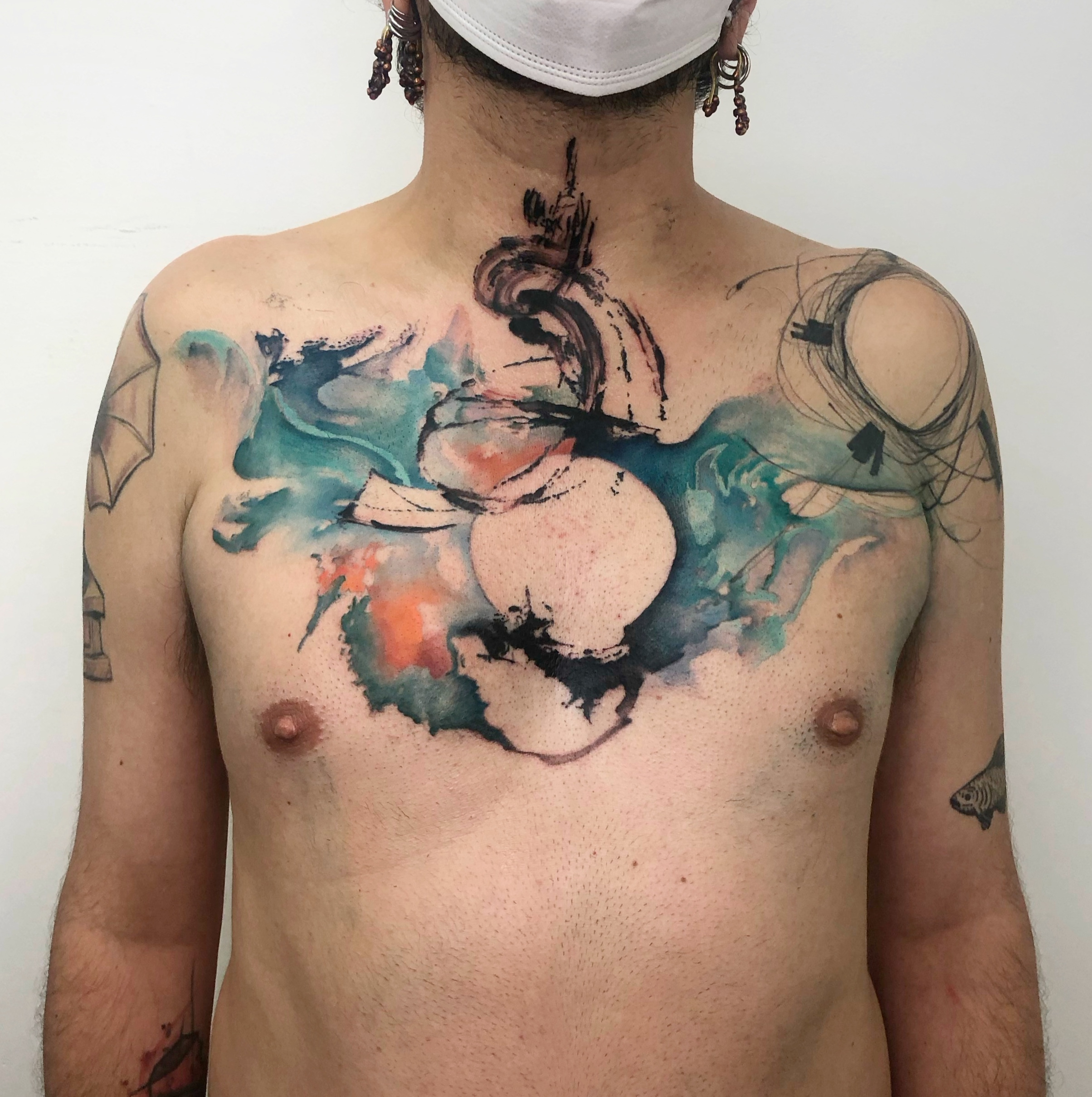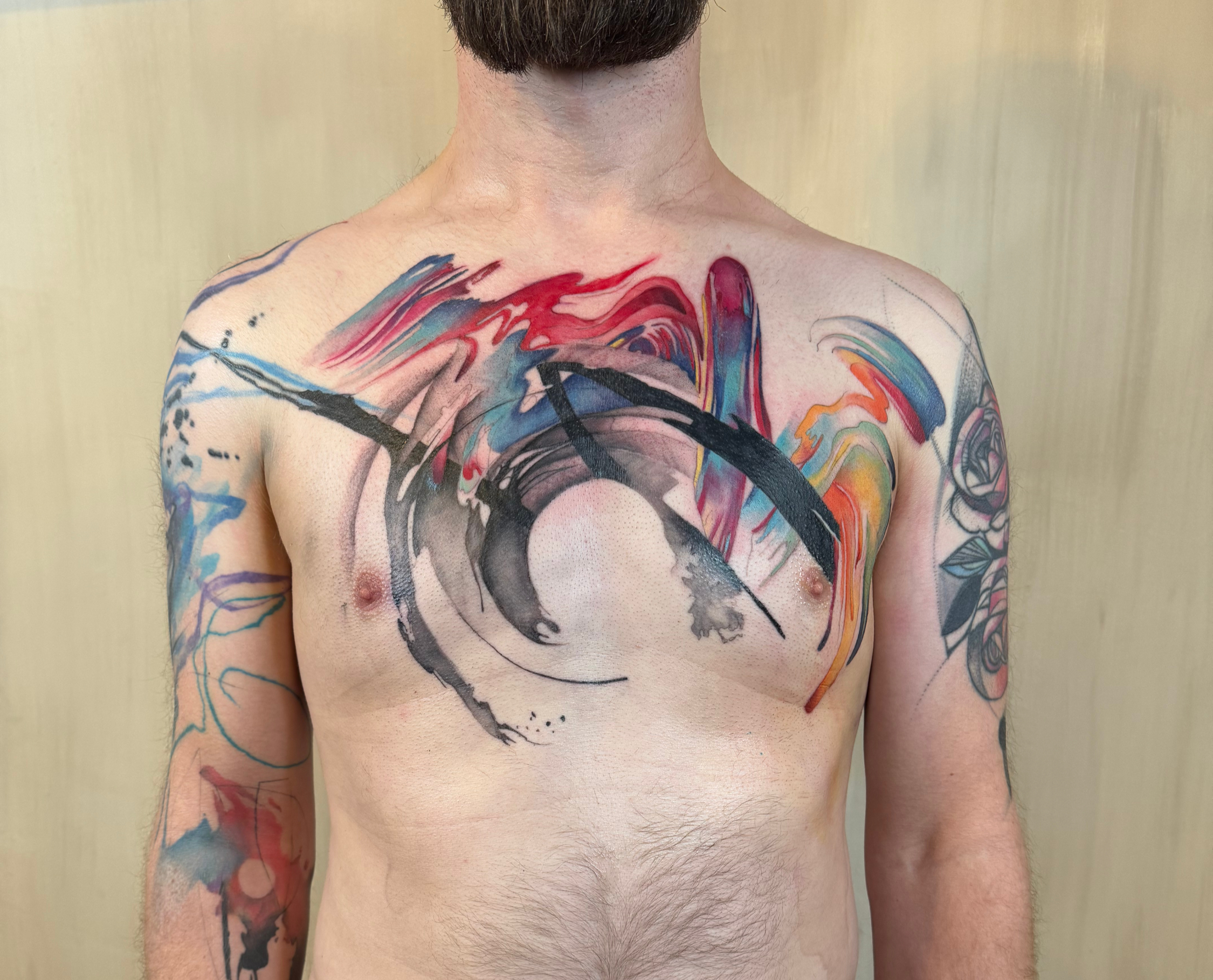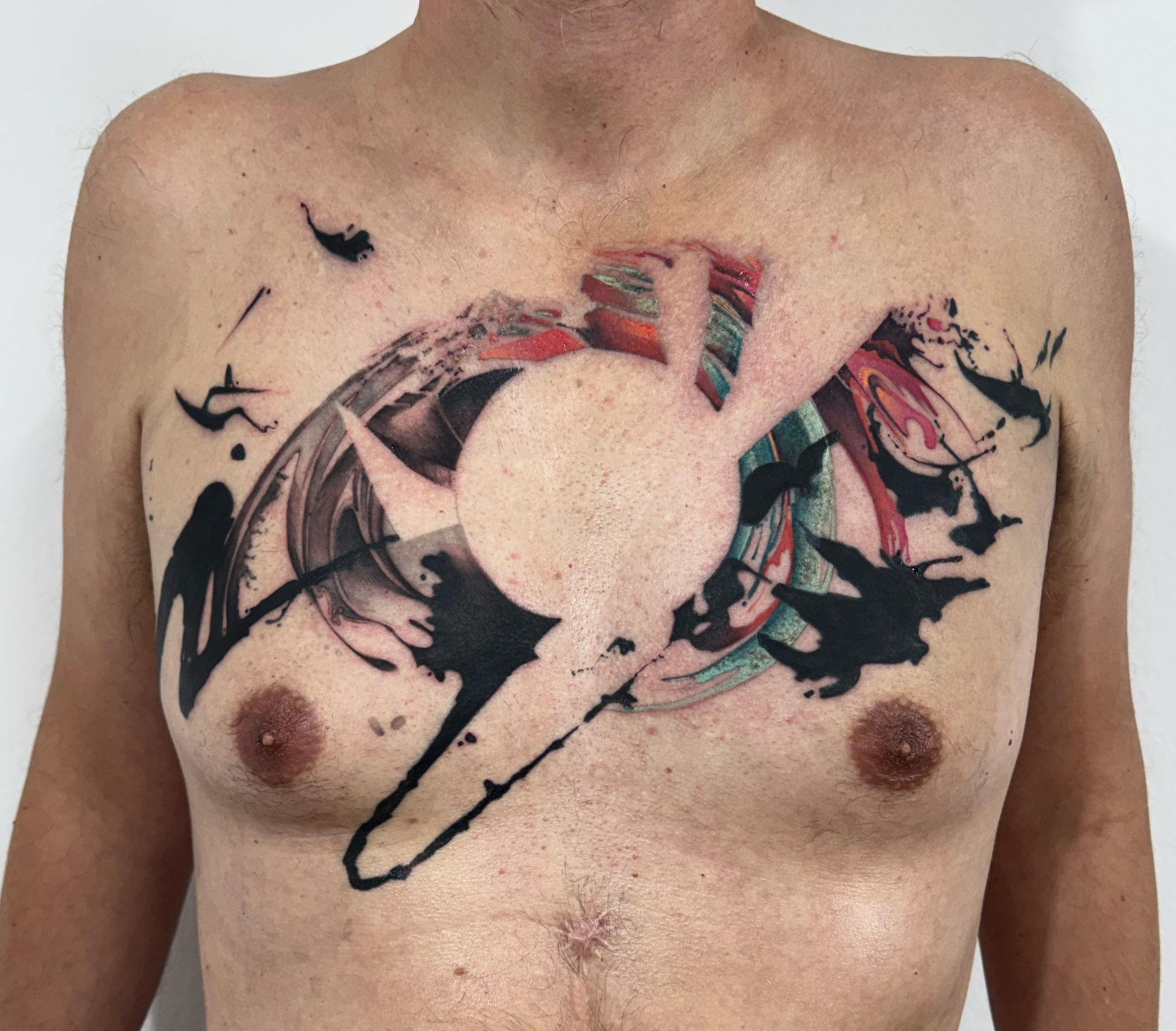 - Large abstract chest tattoo with orbital composition, color field and black gesture elements, centered circular form