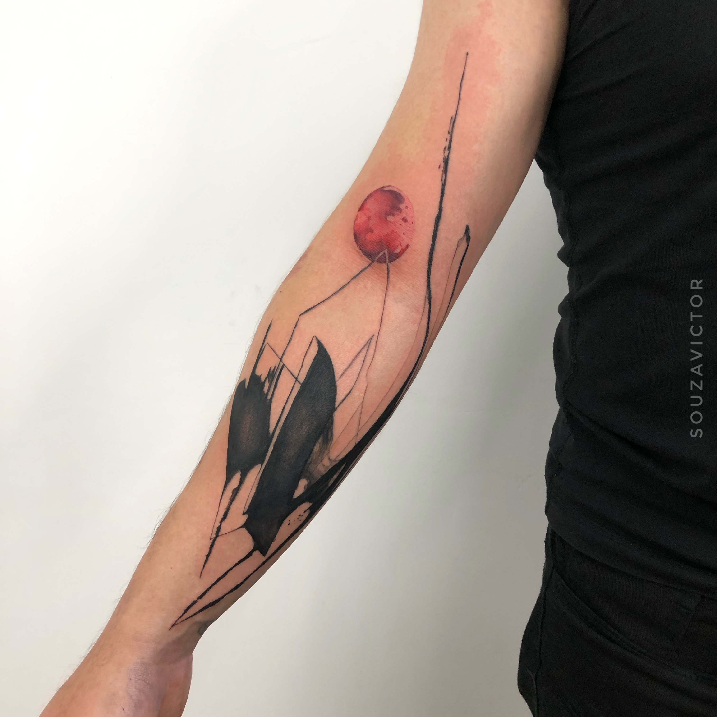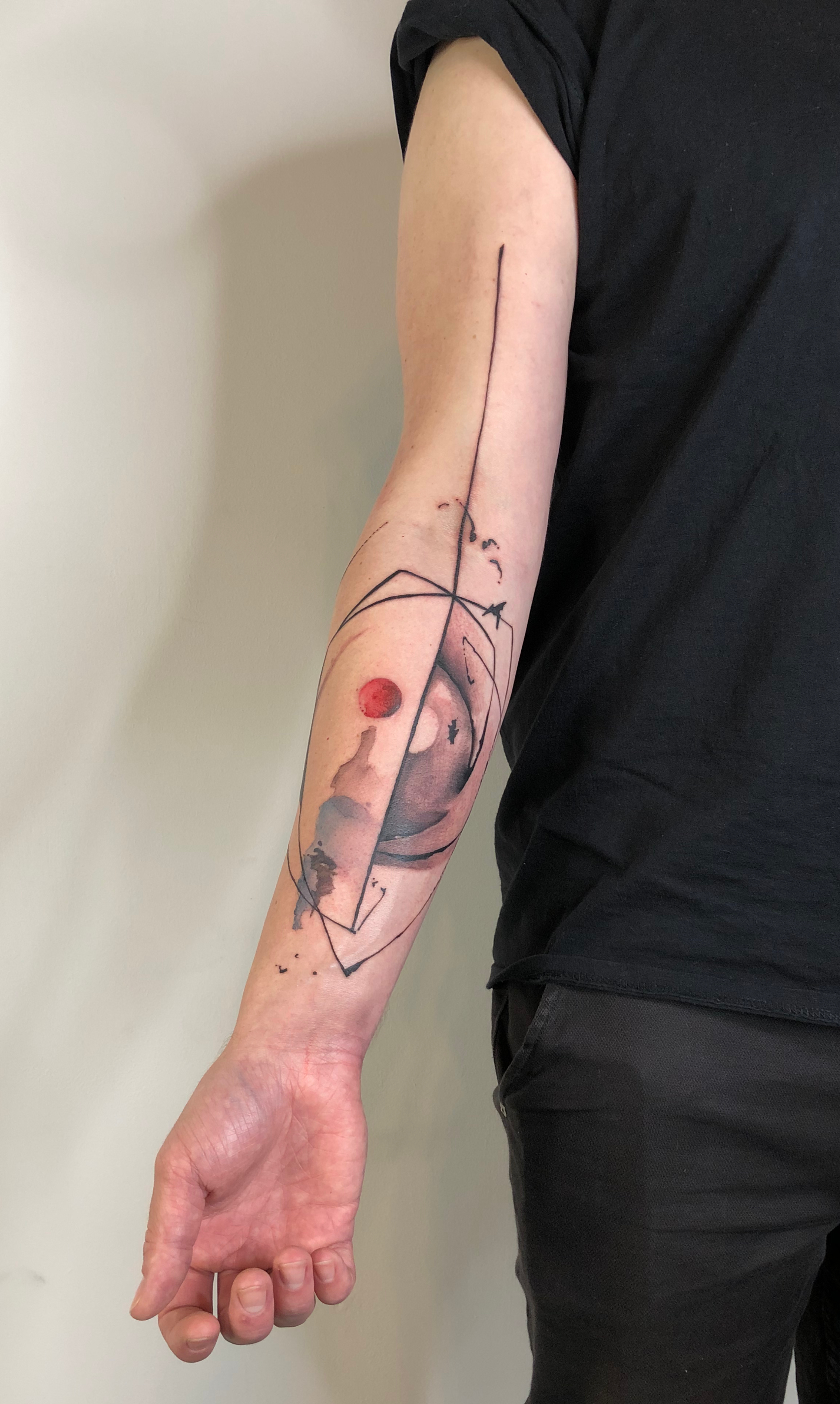 - Minimal abstract tattoo with red sphere and fine lines on forearm, clean composition and geometric balance