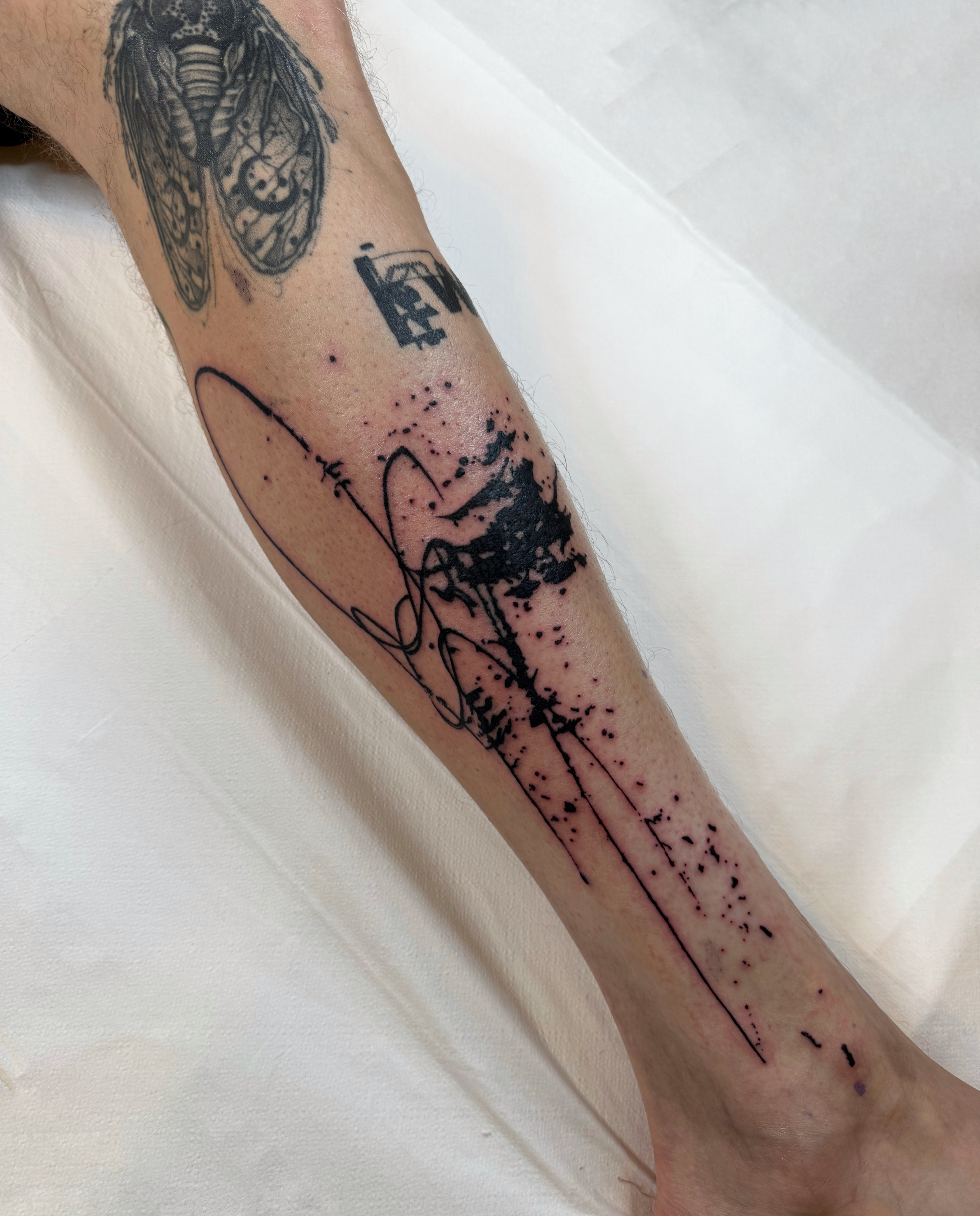 - Minimal abstract black tattoo on forearm with linear gesture and ink splatter, raw composition