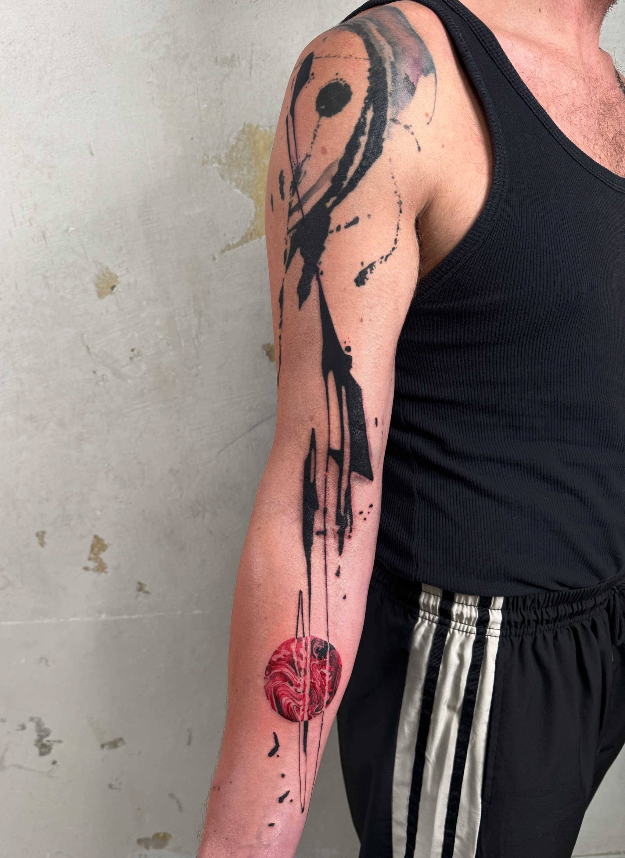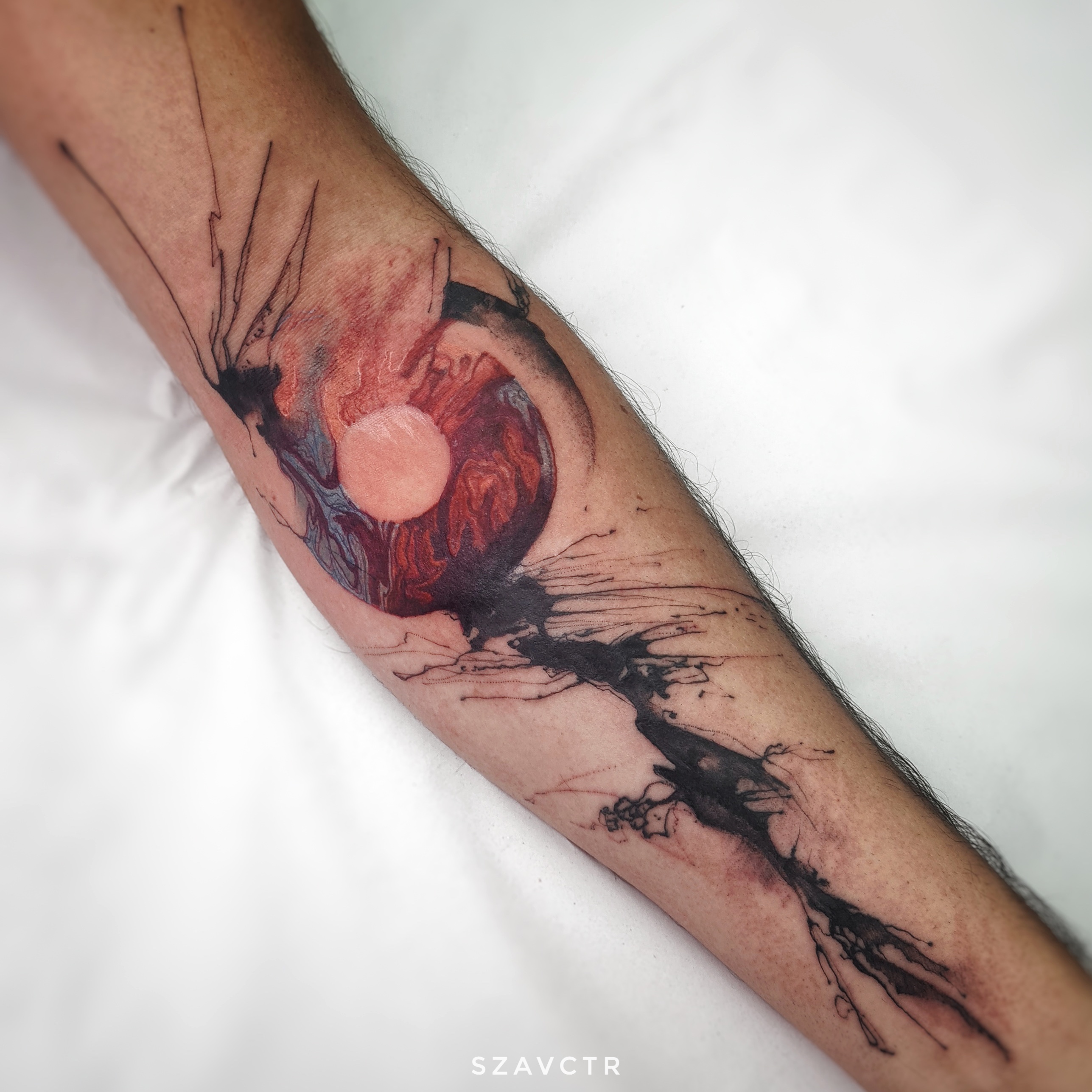 - Abstract tattoo with red circular core and black gesture lines on forearm, energetic and dynamic composition