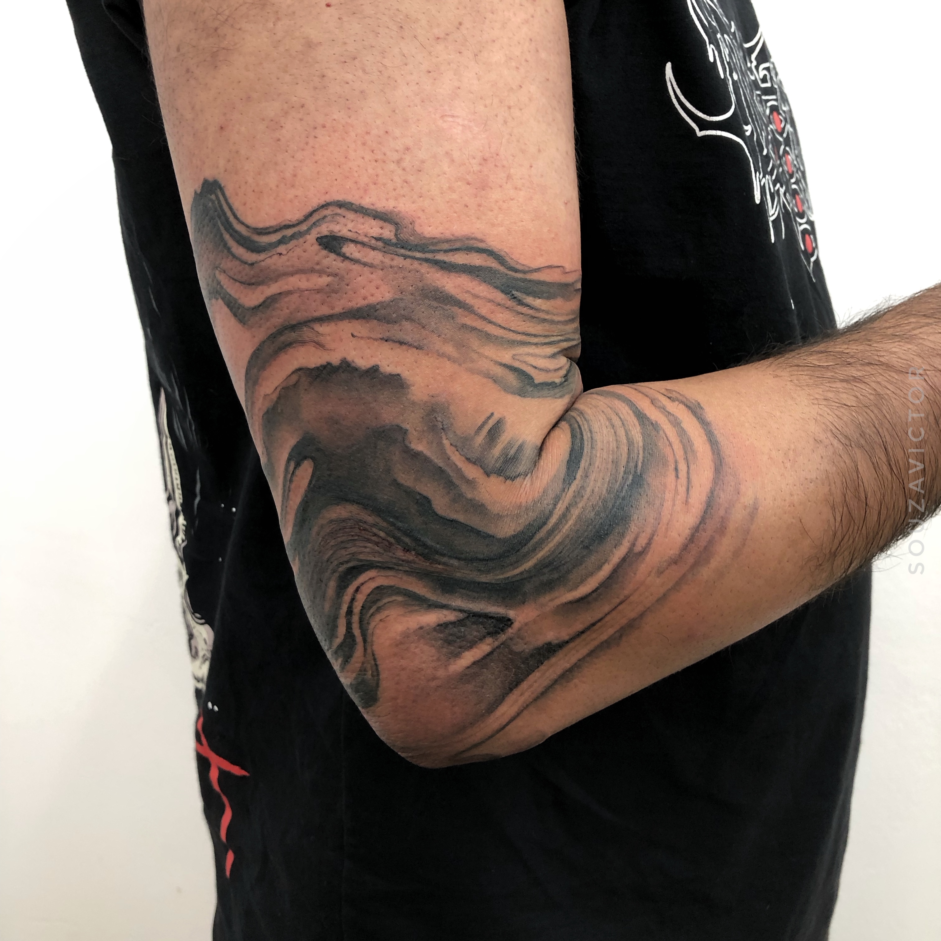 - Organic blackwork tattoo on arm with flowing wave-like composition, strong contrast and fluid structure
