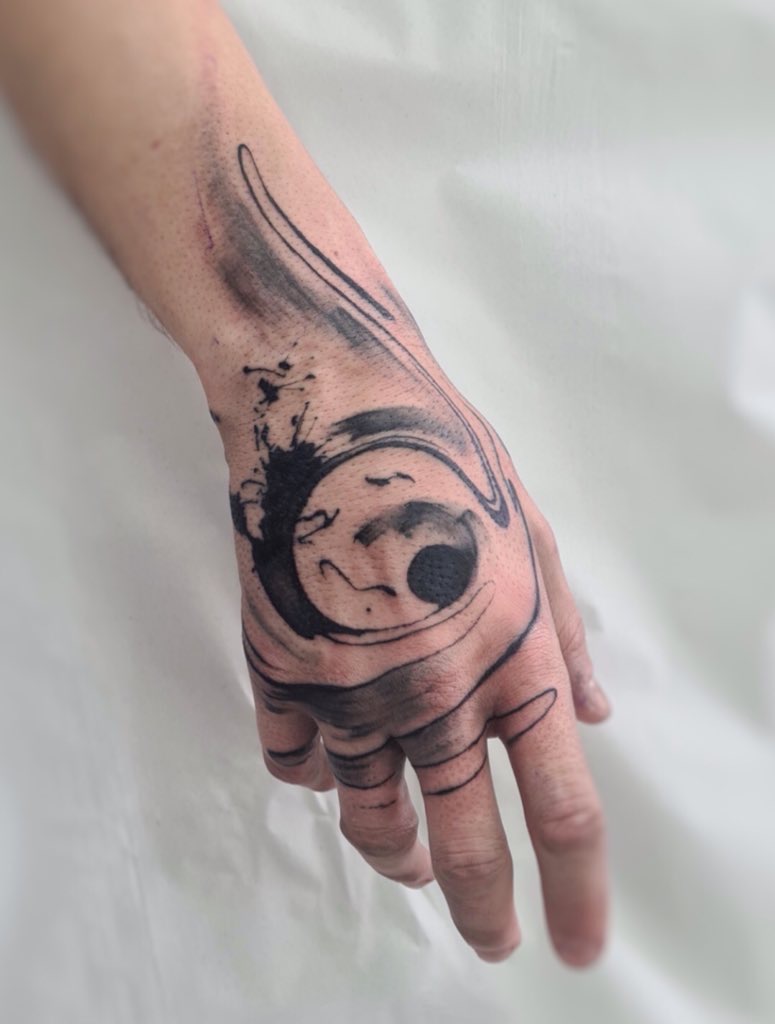- Abstract orbital tattoo on forearm with black gesture and circular composition, textured ink and dynamic movement